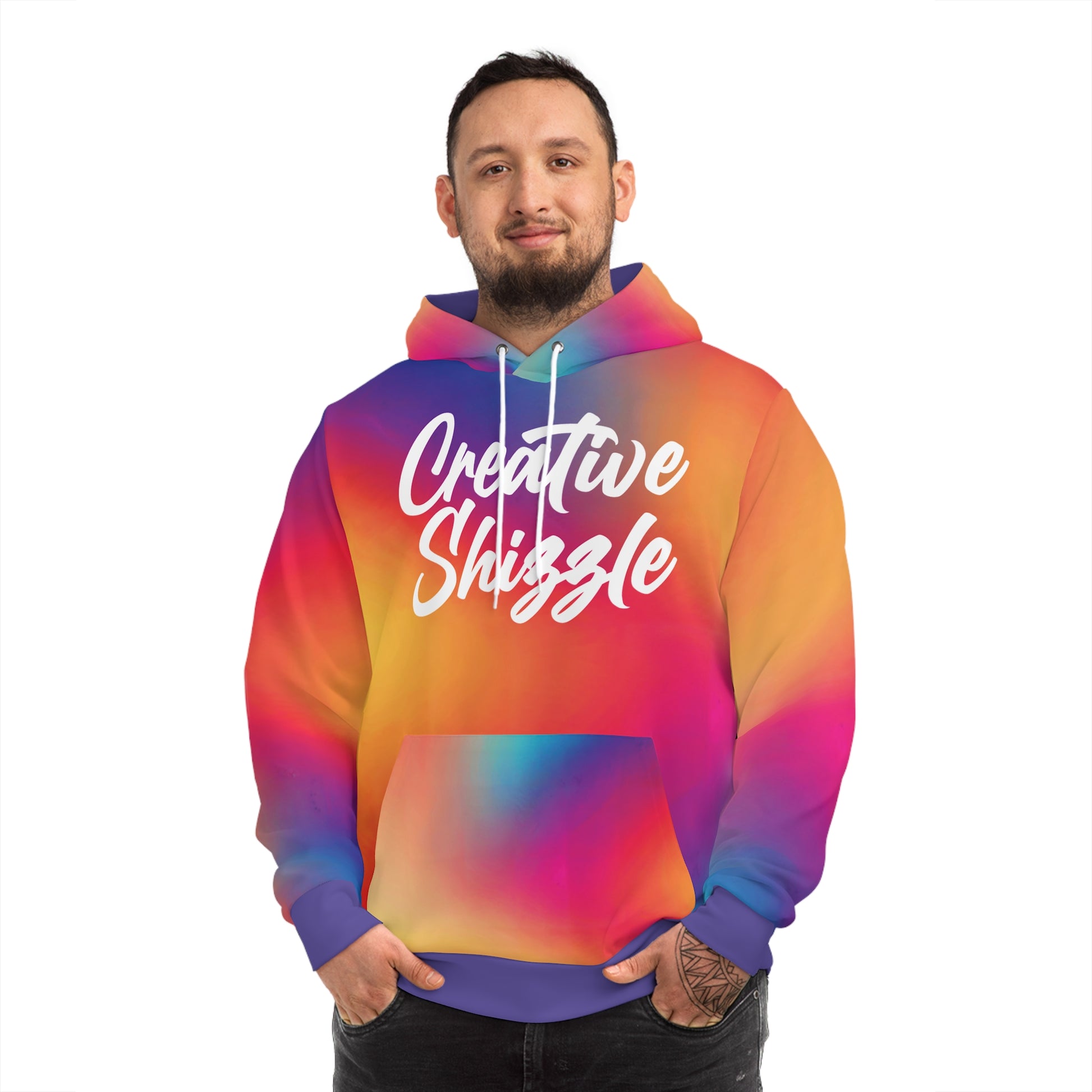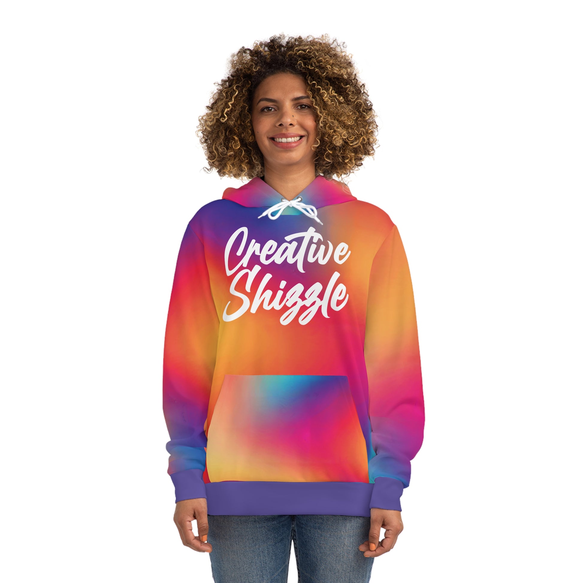 Elevate your casual wardrobe with this eye-catching "Creative Shizzle" all-over print hoodie featuring a stunning tie-dye inspired gradient that flows from deep purple to electric pink, sunny orange, and cool blue. This isn't just another hoodie—it's a wearable work of art that celebrates your creative spirit.